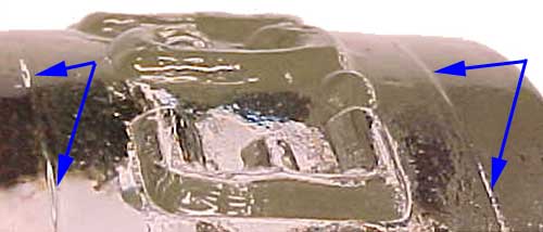 Look for evidence of "mold lines" above and below the embossing. In the suspect pieces, the embossing appears to have been added to the mold with what is called a "slug plate". The "slug" is a strip of metal placed into a groove that was pre-formed on one side of the mold. The insertion of this strip of metal leaves a mark, or "mold line", in the glass when the suspect imitation is poured.