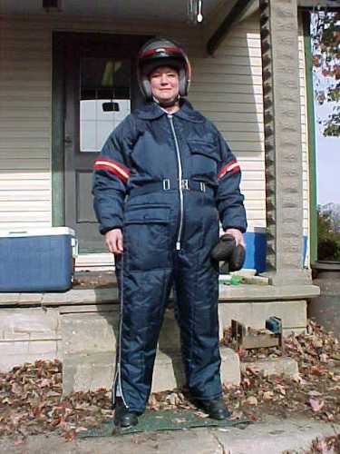 Jill's first motorcycle ride... Steve Blair loaned her this snowmobile suit to keep her warm.