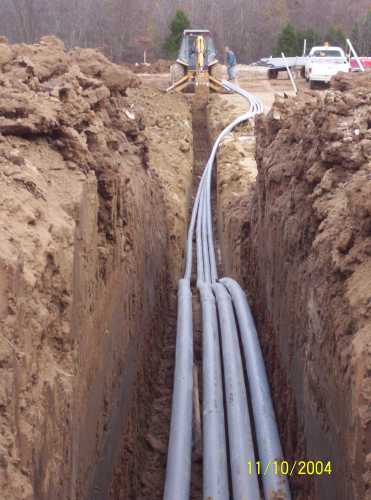 Here's a picture of that looks like oil lines but is really electric, these 4 lines come from the 4x8 pull box. The land where we are working had between 4inchs of water to 9inchs. Each span of pipe is 20 feet.