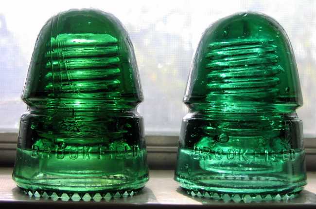 Here's a sunlight picture of two different colored SKEB (Skirt Embossed Brookfield) 145s with drips. In the price guide only one color is mentioned under index [040]. I'm calling the one on the left yellow green and the one on the right green. So, do I have a new color listing for the price guide? The yellow green one I got off eBay; the green one I got from Judd Moody in a trade. Although the price guide lists the green only in the $10-15 range, I have found these very difficult to locate. Barrett Nicpon has apparently found a few in Canada. |
