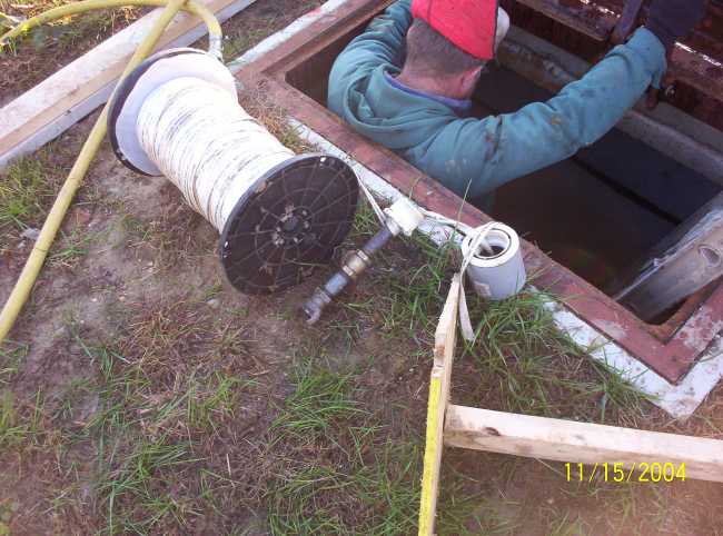 Well here's one of the vaults that has 4 lines running to another vault 800feet away. Dirty job is getting down there in the water and mud. you can see the rope we use and our " rigged stringer ". The coupler goes on the end of the pipe and the string goes to a birdie we put in the pipe before the coupler then we attach the air hose to the end. *see next photo* |