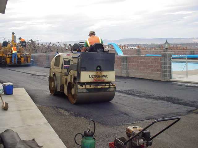 These are the machines they use to lay asphalt, a roller and the paving machine in the background. It was a little cold this morning check out the steam.
