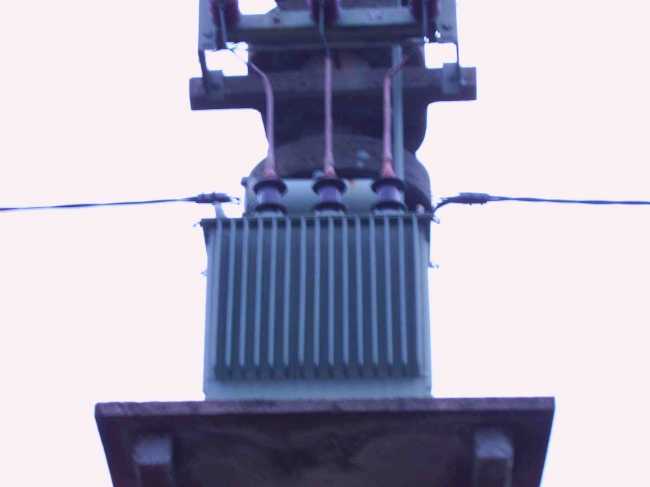 Closer view to the transformer of the pole. The two lines you see on the picture are insulated 230/400 volts-cables.