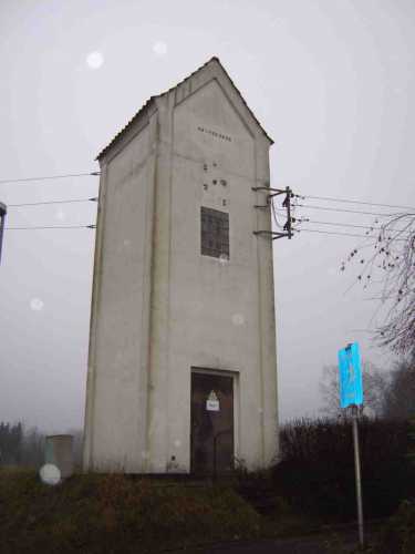 This picture shows an older German transformer house with a 10 KV --> 230/400 Volts Transformer near Lengerich, Germany. The line in the front of the house is the 230/400 Volts line, in the back of the building you see the 10 KV line. Above the window was a 230/400 Volts line installed, too. This line is removed and replaced by underground cables. In Germany many low voltage lines are replaced by underground cables yet. In some areas it is hard to find a low voltage overhead power line today. Most new low voltage lines are build as underground lines in Germany today. |