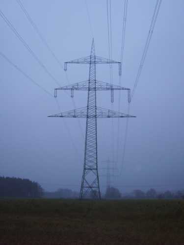 Here is a German 220/380 KV power line pylon. On the left side is the 220 KV line and on the right side the 380 KV line. The insulator chains (brown ceramic rod insulators) on the right side are about 5 meters long (10 feet = about 3,10 meters). Each wire is designed for max. 1040 amps! If you stand under such power line, you can hear the power flowing (Due to the corona effect). |