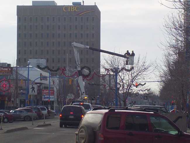 Putting up Christmas decorations in downtown Saskatoon, Saskatchewan. Picture taken Sunday, November 28, 2004