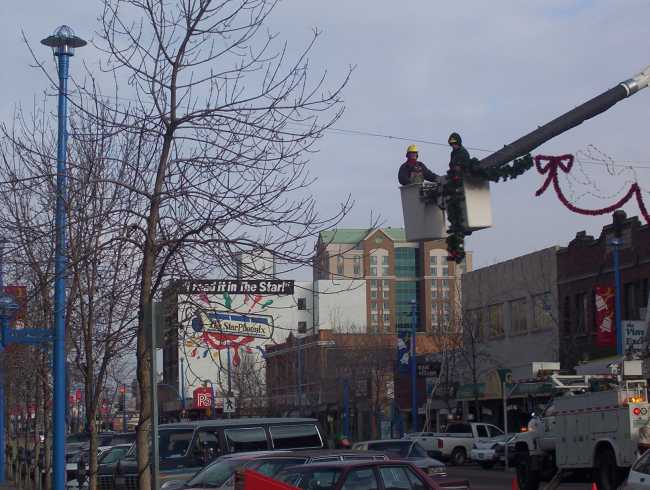 Putting up Christmas decorations in downtown Saskatoon, Saskatchewan. Picture taken Sunday, November 28, 2004