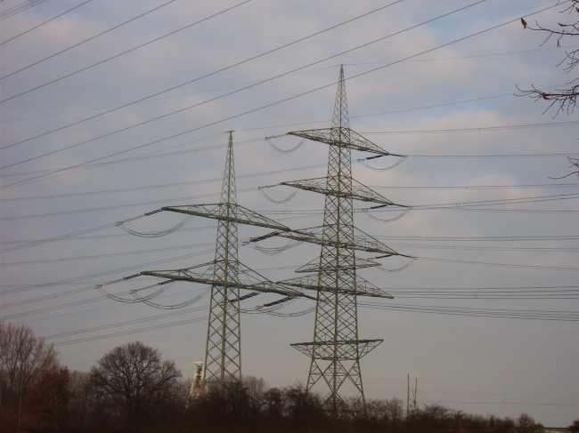 A closer view to this forest of pylons, in the back you can see to rail road pylons an a mine tower of a coal mine, too. The 15 KV-railroad pylons looks very small against the big high power pylons with it's 110 - 380 KV - lines!