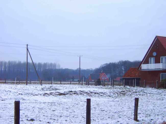 Here's a classic 230/400 V overhead line with a overhead house supply near my home village Darfeld. They are rare today (30 years ago almost every House had a power supply like the in small villages), even in the 90's there are such supplies. Today most residents are connected with underground cables or with insulated overhead lines (they will be replaced by underground cables in the future). In the back is also a 10KV-Power line. |
