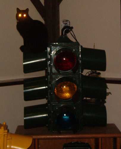 Not all cats get to sprawl on top of the computer, or TV. Here's Pumpkin (aka Kitty) atop my 4-way Marbelite traffic light.