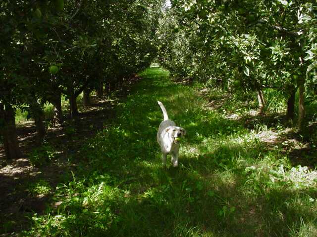 Picture of an apple orchard but it's more like a jungle of trees. The dog can pick apples but won't put them in the bins.