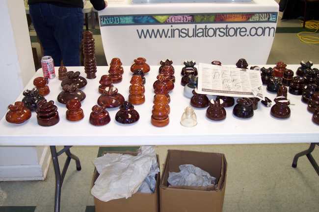 A table full of porcelain insulators for just $5. After haggling on the price, Richard Case finally took them home with him I did not realize the great advertisement for Sandia and Andy Polivka's Insulator Store (www.insulatorstore.com) until I was posting this picture. |