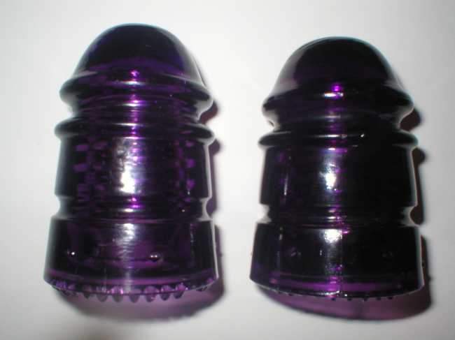 The insulator on the left is a bit darker than the one shown on the right of the previous photo. It also has some milkiness which is not visible. The "braille" on the right is royal purple and as dark as we believe they come in. I will show a daylight-lit window-sill sill line-up of these in the near future so that you can capture and appreciate the full beauty of these very neat Canadian insulators. They are my favorites! |