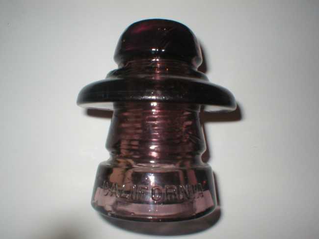 California marked insulators are a delight to see here in the East! Here's one of my favorites that I own. It is a CD 200 California in a rich, dark wine-colored purple in great shape. As you probably figured out I love double-grooved glass insulators in purple! Enjoy, Tracey Beckham. |