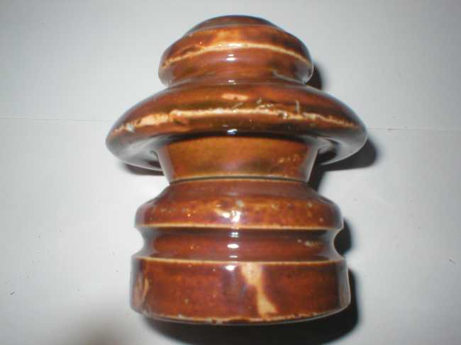 Here is a classic Fred Locke two-piece transposition insulator. It is in the classic fawn or tan color that most early Fred's I know of are seen in. The photo shown is of the insulator held together (nicely) with a standard pin cob. I am going to show you two subsequent pictures here: one of the two parts separated; and the other a top view of the assembled insulator (showing the best I could with the lettering). |