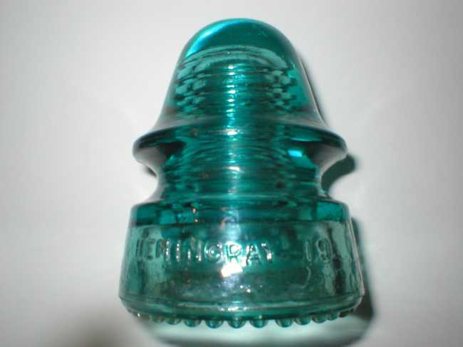 This has got to be the most difficult insulator to describe...color-wise! This piece along with a couple others came from a short stretch of fire alarm line in SE Massachusetts years ago intertwined with some half-clear/half-blue Hemingray-19's that are otherwise identical! Normally Hemi-19s of this type are clear, ice-blue or aqua (or some other exotic darker color). This one could not make up its mind if it wanted to be clear or blue! The photo does not capture this one very well. All I can say beyond this is the fact that my friend Joe M owns it will attest it is the strangest Hemi-19 he has seen! By the way, this one has RDP. Joe also mentions that among the several excellent Hemingray-19 "signal" displays that he has seen (including the incredible one at the 1995 Marlboro, MA NIA National) this is a piece he has not encountered before! Wow! |