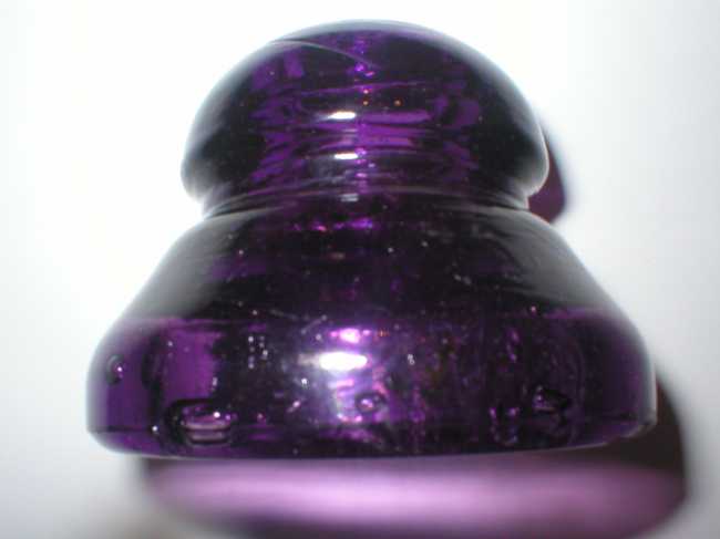 Here is a side view of what I believe is a CD 191 Denver-made product. Note the bubbles in the glass (a couple have popped through the base rim). At the top of the pinhole are some sideways "filing" marks which I have not seen on any similar "diamond" two-piece insulator upper sections. Any corrections/info would be appreciated. I am going to follow-up with another photo of this neat piece. |