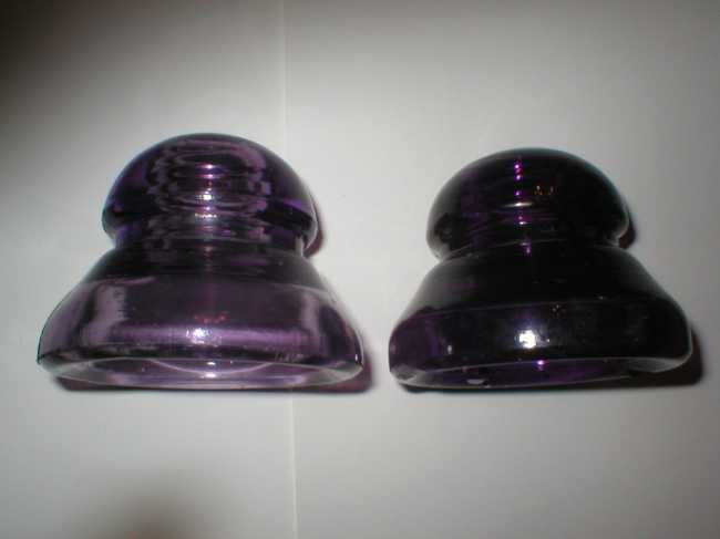 On the left is a purple "diamond" (unembossed two-piece transposition top (in lighter purple) compared to what is believed to be a CD 191 made by one of the Denver glass insulator companies (on the right). As you can see there are molding differences. You Denver and Canadian glass guru's likely can tell more differences in a heartbeat! These photos are provided by me for comparison (only) and for further education that may evolve from these depictions. Thank you. |
