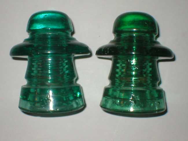 That's my archeological relic dug by me shown on the left. And on the right is another relic (but in nicer green!) that Joe Maurath, Jr. got from a dig. No, I mean a dug. Dig! No!!! I mean from a Doug! That's right! He got it from Doug MacGillvary way back in the 1970s for some paltry sum at one of the Connecticut Polecat shows back then. Since Joe only had just enough pocket change to fuel his 383-four barrel 1968 Plymouth Road Runner back home (not mentioning Mass Pike tolls) Doug was kind enough to let Joe have this insulator (inner skirt chip and all) with a monthly payment plan. How much? Back then CD 200 Stars in green came sorta cheap so I hear, and I know those two guys struck a good deal! Joe acclaims to this day how wonderful it is to deal with Doug M and things certainly have not changed! Two wonderful pioneers in this hobby to say the least! |
