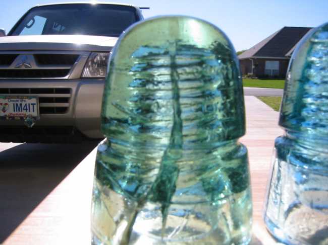 Here is the only light color shade of green CREB I currently own. Looks like it took a good hit. Guess this one was semi- bullet or BB proof. The crack runs all the way up to the dome. It goes deep all the way to the inner skirt and threads. It really refracts light in an interesting way. |