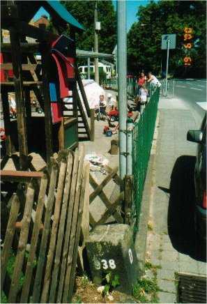 A state border, the kindergarten is in Belgium, the street is in Germany. The border marking stone is near the fence.