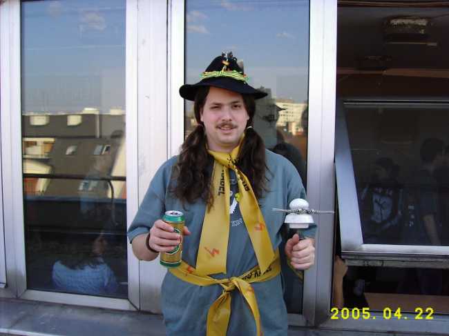 I am there. We got points for the stupidest face.. The hat is full of LEDs, the yellow tape is earth cable sign one, Insulator and beer :-)