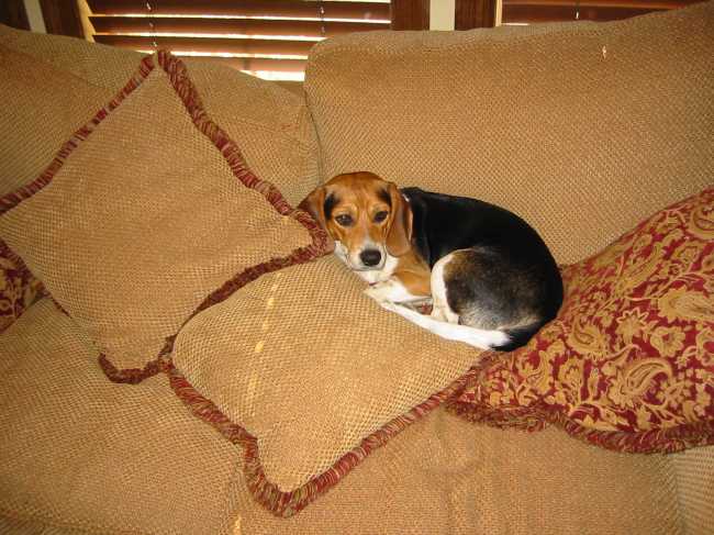 My beagle Toby always runs for his favorite spot on the love seat when it's time to go in his kennel when we leave. If my wife or myself are home he sits here waiting for the other to come home. The love seat is just a couple of feet from our side door and he can see when one of the cars pulls up. He runs up to the door glass and starts pogo-sticking up and down. |