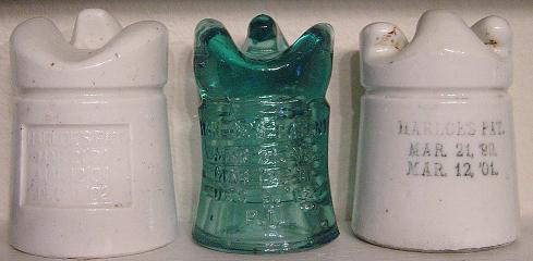 Here are three of the four styles of Harloe no-tie insulators. Both the embossed and ink stamped porcelain styles (U-184) and the glass CD 109.5 are shown. Not shown is the glass Harloe with an inner skirt CD 206.5. These insulators are covered by the following patent: http://www.nia.org/timeline/patents/0715375.gif |