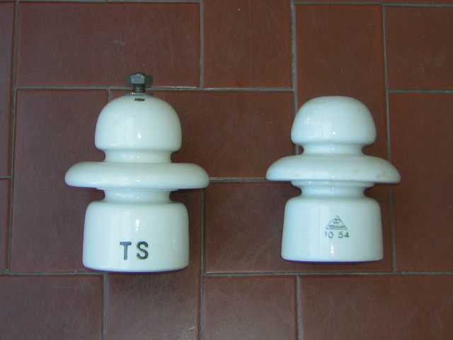 Two transposition insulators: on left the IMEC (Industria Milanese Elettro Ceramica) one, with TS marking (Telefoni dello Stato - State Telephones), the other one is a Verbano mod. ARGEA 77. They both date 1950s - 1960s.