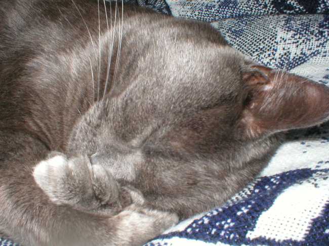 Snookie has been shown here a couple times in the past. He convolutes into these very "catty" positions as you can see. If not in time one may miss a precious "Kodak Cat" moment if the camera is not handy! This time it was and this photo is among our favorites! Taken by me while Snookie was in a deep sleep. He's not the least bit camera shy! His paws are intertwined around his forehead for cat comfort! |