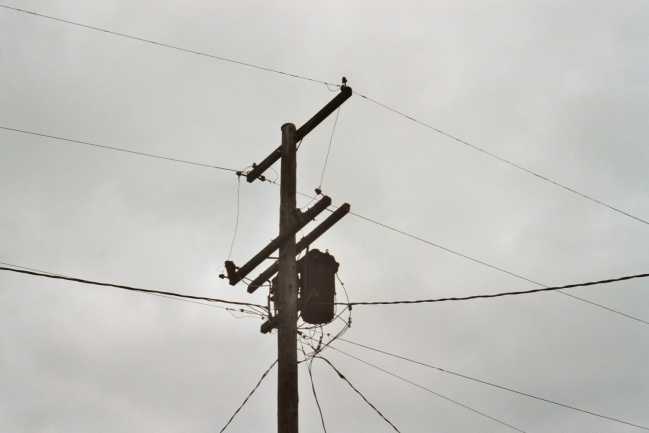 The pole is on a side street and to the right, the wires are coming from the 3 phase 4160 V. line along the main street. (11th). One 2400 V. phase on the upper right insulator feeds the big xfmr. and keeps going down the street. The other 2400 V. phase on the upper left feeds the small booster xfmr. and dead ends. The wire that continues from it to the left is actually a dead section guy strand to the next pole to keep the crossarm balanced and from twisting. The neutral (grounded wire) is tied to the CD 162 on the lower crossarm. |