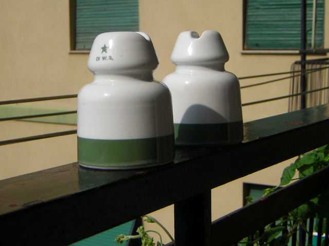 This insulator, circa 80 yrs. old, has a very nice green stripe, and a green star with DI.W.S. writing on its top: it's in mint conditions and gives a tone to my collection..... isn't it great?