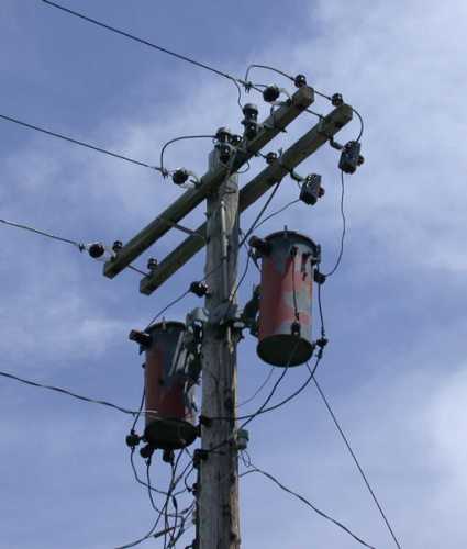 2400V circuit converted to 4kV; note the arrangement of the primary wires and the now-empty insulators. Also note the 'transformer trainer' insulators. Mohall, ND.