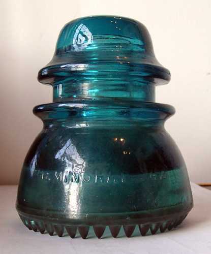 154 Hemingray - 42 / Made in the U.S.A. Deep Hemingray blue. Found this one in a shop outside Cincinnati, Ohio. The drips are unusually long (almost a half inch) and very sharp. From the feedback I've gotten, these long tooth specimens seem to have been found mostly in Ohio and also in Missouri. Thanks to everyone who has written to me with additional info on this Vampire of Muncie. |