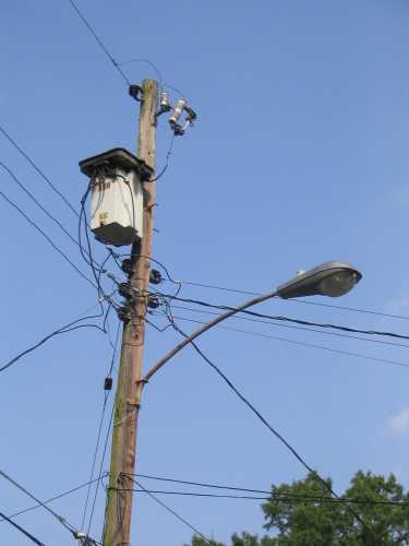 Old 4 kV primary dead-end with a 25 kVa transformer, mercury-vapor light and a number of triplex services. Surprised that old transformer is still in service.
