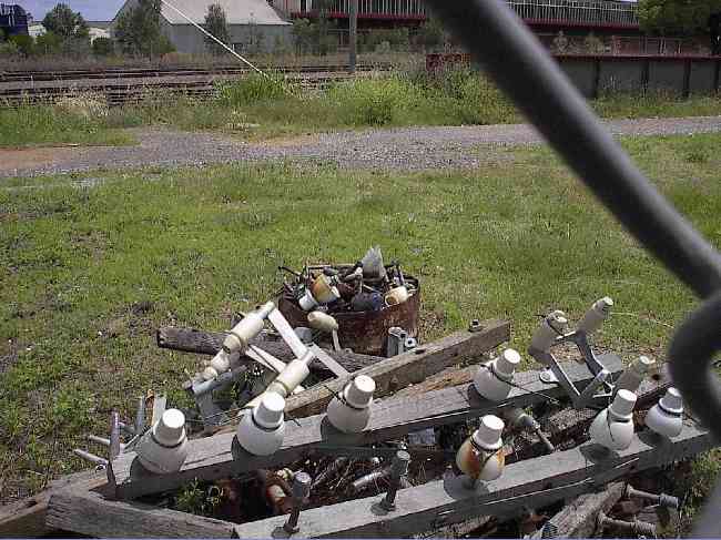 This is the linemen's yard at West Tamworth Railway Station, Can you see the Purple CD 490 in the half drum. I have found many pieces of railway history here and been given plenty by those that work here, including telephones, tool boxes, timetable frames, signal lamps signs and a very old leather lineman's pole climbing belt. [IFONA U Group] |
