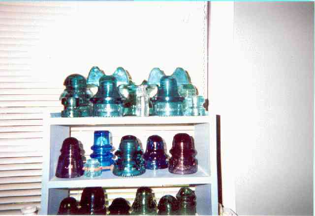 Here is more glass: CD 161 California in purple-plum, two Mickey's, And the CD 162 Hemingray in a nice Hemi-blue in the center. I retrieved this on myself off of an old building, it was caked with soot and paint and after an acid bath it is sparkling! If you look closely you can see a small corker bottle which is made of very thin glass and is clearly marked H.G.Co. on the bottom. It is amazing that this has survived as thin as the glass is. Any information of the value is appreciated. Just send me an Email. Thanks |