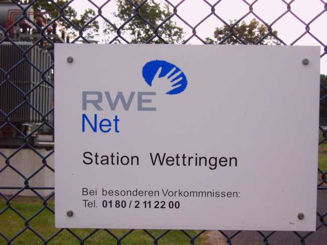 A sign with the logo of the power company, which owns the substation in Wettringen. "RWE" stands for "Rheinisch Westfaeliche Elektrizitaetswerke", one of the four big power companies in Germany (Eon, RWE, Vattenfall and EnbW).