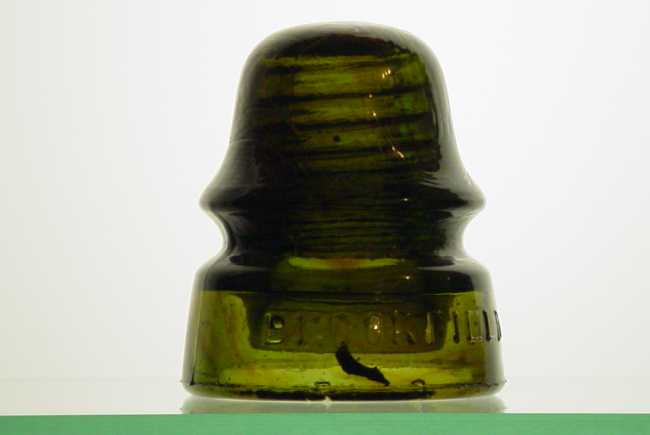 Great example of bad quality control. This is the [040] index (F-Skirt) Brookfield (R-Skirt) New York SB. The color is a dark olive with amber and a nice carbon chunk starting in the O and tails to the base.