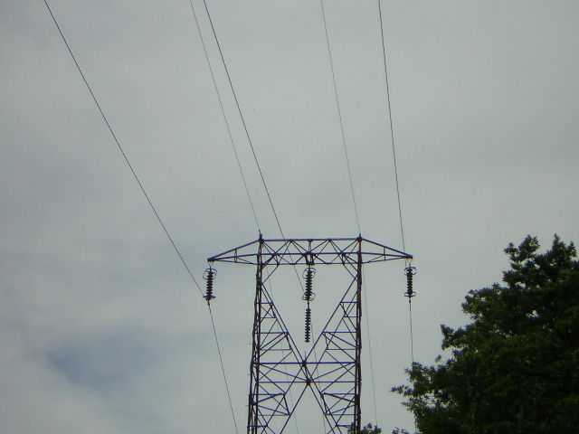 In this picture you can see a string of insulators was added to ballast the central wire against wind. Below, this string is not fixed. Line voltage is 132 kV. Photo taken across the Tuscany and Emilia Romagna border, Aug, 6, 2005