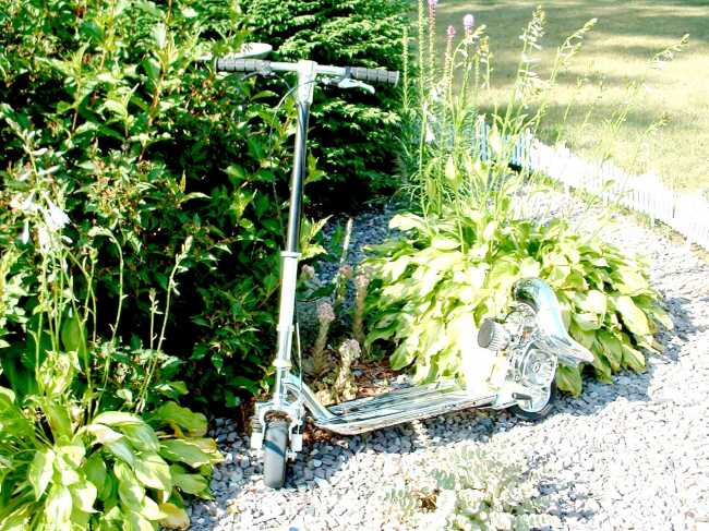 This is my other interest, scooters, I have been into them for over 4 years and I was able to build this one up for a little over $300 with all the Christmas blow out sales. This scooter is called a Go-ped, they first came out in looking almost like this one, but much stockier looking back in 1985, and from then they have come out with tons on accessories for them, and I also am a 2-stroke engine expert mechanic, and I know everything about them, inside and out, and I enjoy this hobby just as much as insulators, and my scooter has a beefed up aluminum chrome plated frame, with a powder coated cnc machined billet deck, shocks, Tygon fuel lines and a Zenoah 26.8cc rc car/airplane/boat engine with racing carb, filter, exhaust pipe, NGK iridium plug and lightened flywheel, crankcase/cylinder/intake/exhaust porting and a bigger drive spindle to gain more top speed, this thing goes 32.684mph and I'll tell you it can get very scary hitting speeds like that on this little thing, and it runs on 95 octane with 8 oz. of Xylene per gallon to 93 octane to get it to 95 octane. |