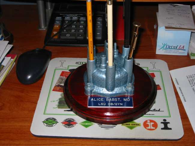 The perfect desktop addition( I think )for do- it-yourselfers, mechanical enthusiasts, craftsman, etc. Back in the day, before recycling was in, my grandfather found a neat way to recycle old distributor caps (now less common in cars). He would drill out the contacts, paint them, and mount them on a homemade stained base. Voila!! A nice unique desktop pen & pencil stand. Unfortunately, this one I made has a store bought base (I don't have wood working tools) but I did stain it. My grandfather must have made dozens in his later years and given out as gifts. |