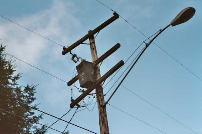 Another view of the unusual square pole transformer in service on the PGE system in Oregon. There are some other unusual details about this installation. The pot is hung on a double strap crossarm hanger that was in style 30 years before this transformer was built! The pot has a top mounted bushing which indicates it is old but not ancient. Note the gray rubber bushing protector to keep the squirrels from becoming road kill. I call these "witch hats" and they were installed on transformer bushings in forested areas within the last 10 years. The voltage is 7200/12,470 Y primary and 120/240 v. secondary. Note the 4 lug secondary bushing arrangement, another throwback to an earlier era. I am so curious as to the make of this pot, that I am contemplating renting a bucket truck for an hour!......will keep you posted. |