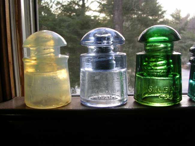 Just more of those "boring" CD 128s L-R: Opalescent Hemingray E-14, Argentine Cristalerias Vidrart in Cornflower blue, and Uruguayan SAFNV /CSC in emerald green. The latter has a 1" dia threaded pinhole, the other two have the standard small "carrier" pinhole. The vidrart has a metal liner in the pinhole. |