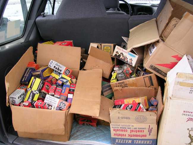 Sometimes, glass was used to make vacuum tubes (those predecessors to the transistor and integrated circuit). This is a load of tubes I got at a recent ham radio swapmeet. When I'm not gathering glass, I'm repairing and building tube audio amplifiers for fun. |