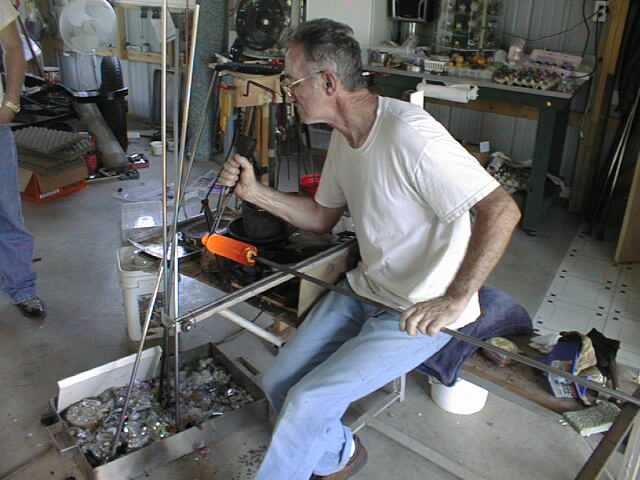 Once the cylinder has all the colors applied and is reheated. It is rolled and twisted to give the "swirl" effect in the glass. Here we see Sam snipping off the end of the glass preparing to start forming a marble.