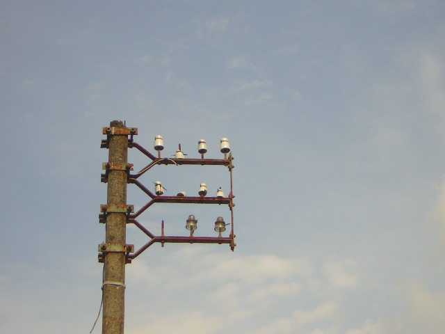 One of the LV poles, with many insulators: the glass ones are from the U.S.A. Other poles like this one are on the factory walls.