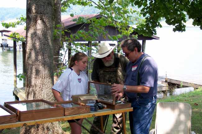 Here is a picture of our youngest member Bonnie Powers and her father Calvin from New Castle, VA. They look on as Skip Henderson displays his extensive radio strain collection. Skip made the trek from Chapel Hill, NC.