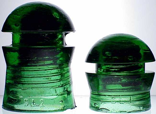Here's a pair of attractive Yellow Green Romanian insulators embossed S.L.1 and S.L.2, with STAS-59 on reverse. One French insulator specialist told me these are believed to have been made in France for the Romanian market. The small feller is currently unlisted in GIFONA and to my knowledge has not been assigned a new cd number yet. The bigger piece I believe is CD 408, although it looks similar to some of the US made CD 128s out there. [IFONA CD 408 409] |