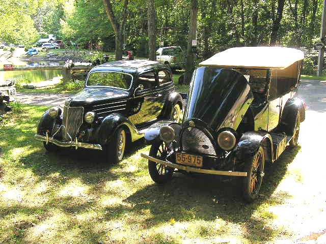 They just don't arrive, they arrive in class. That's a 1936 Ford parked next to a 1922 Franklin. Nothing shabby about this picnic! Nothing wrong with the Franklin, just showing off the engine.